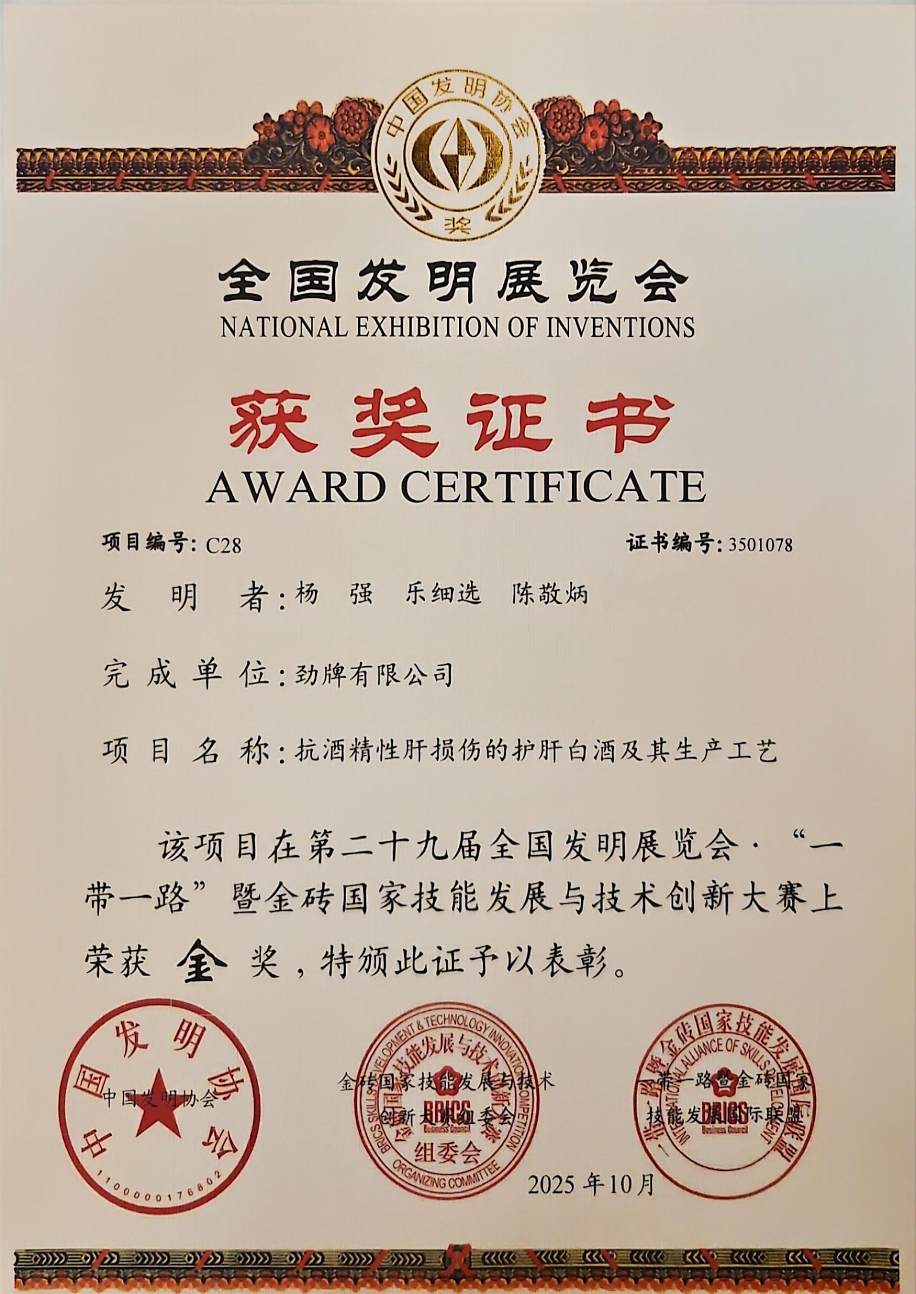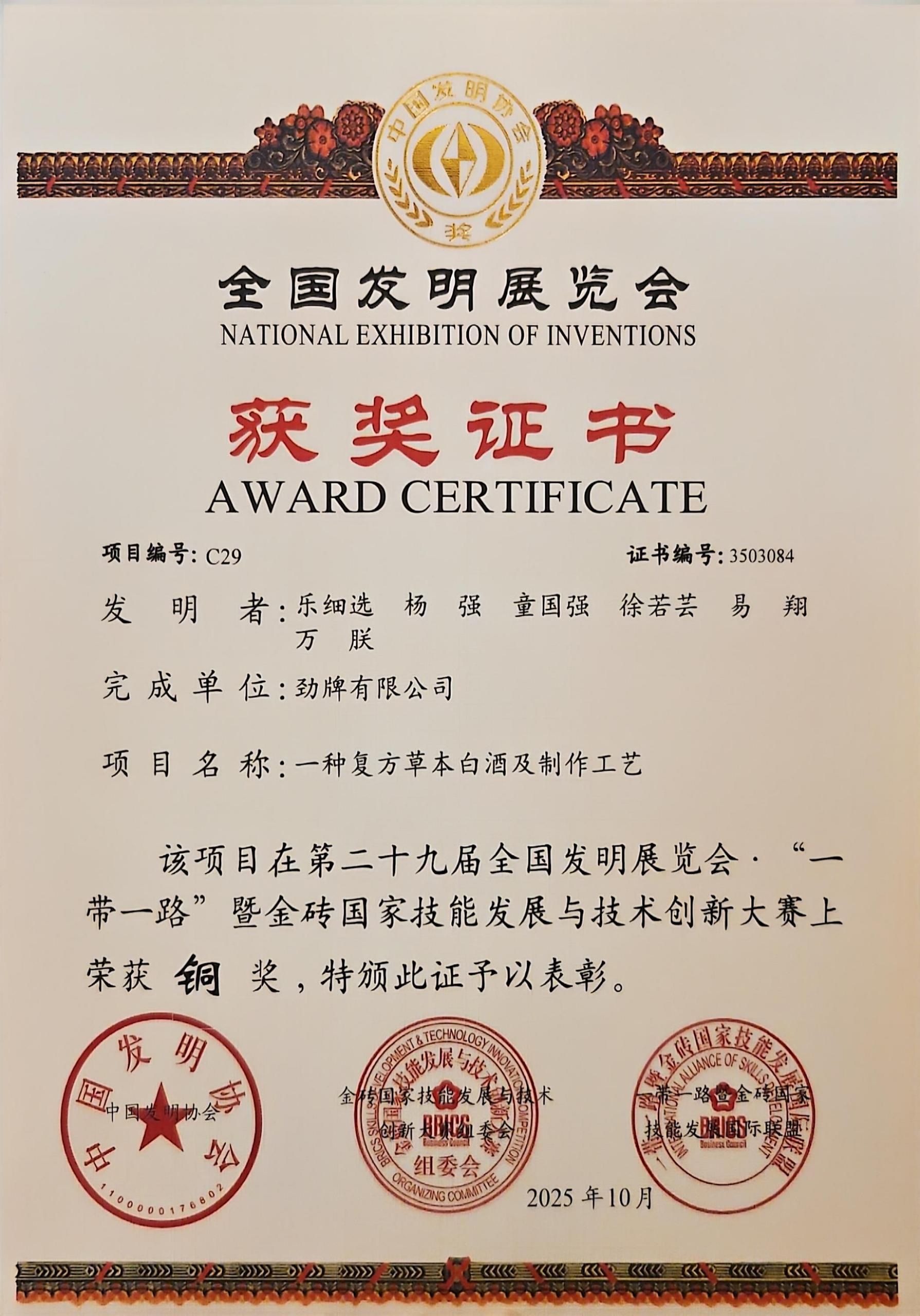 据了解,本次大赛重点关注数字技术如何推动产业创新,促进技能人才培养与国际合作,共吸引了国内外400多项发明创新项目参展。劲牌公司的“抗酒精性肝损伤的护肝白酒及其生产工艺”项目获得金奖,“一种复方草本白酒及制作工艺”项目获得铜奖。